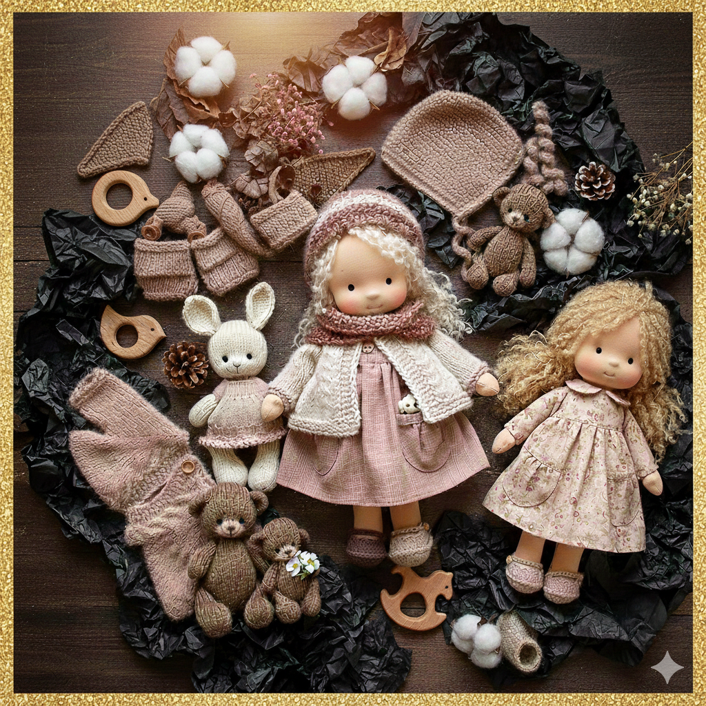 Ella™ | Handgemachte Stoffpuppe mit gestricktem Set und zwei Kuscheltieren